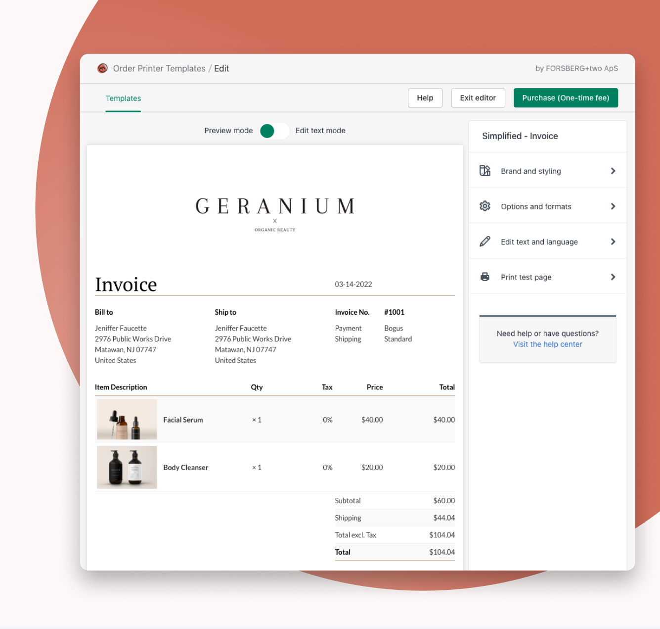 Customize, translate, and test your print designs quickly. Use your beautiful new template in Shopify's free Order Printer app or our Order Printer Pro app.